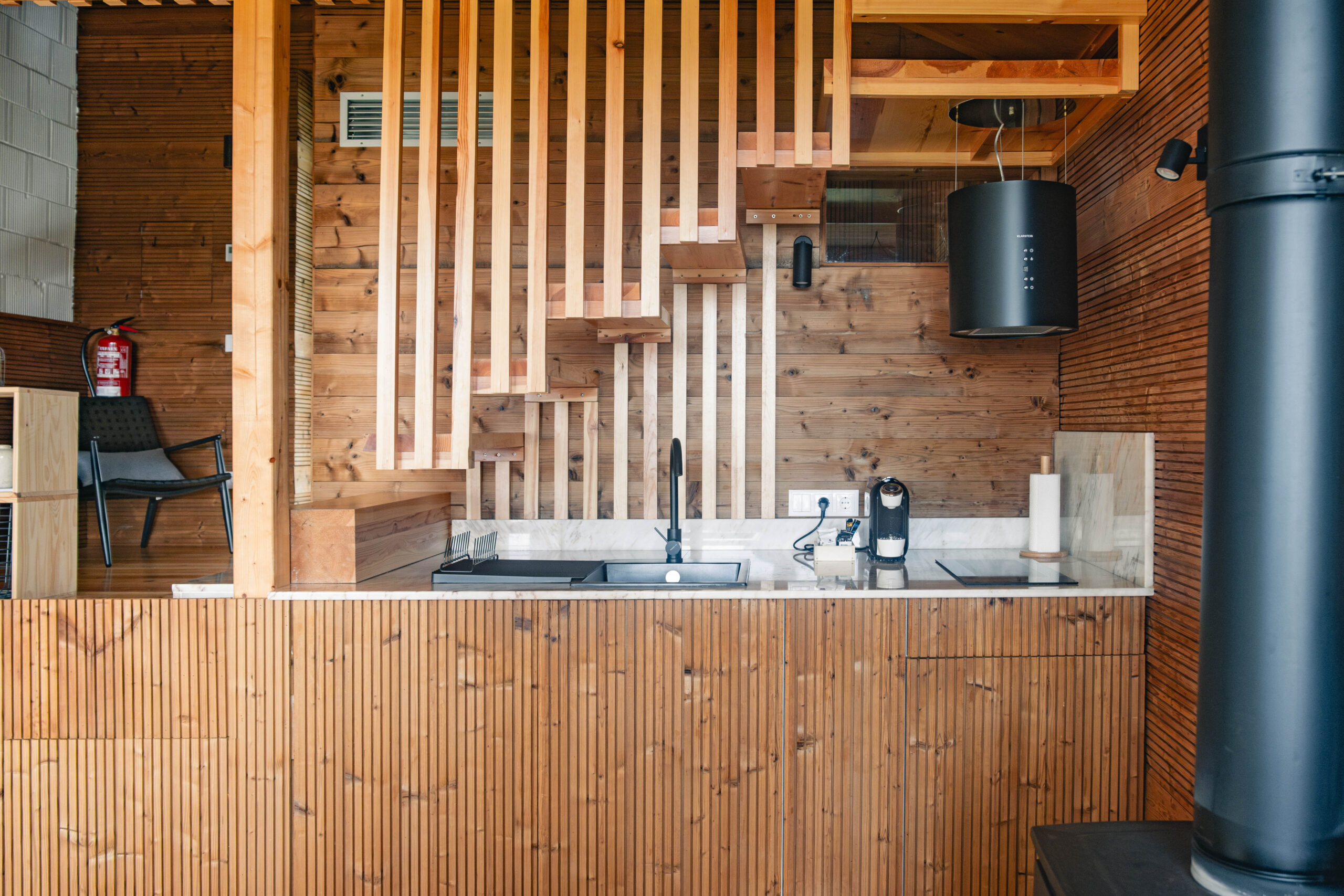 - Cocina totalmente equipada: vitrocerámica, microondas con función grill, cafetera con cápsulas, platos, vasos y cubiertos. También dispone de ollas y sartenes.