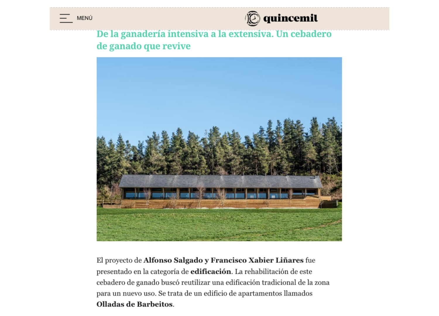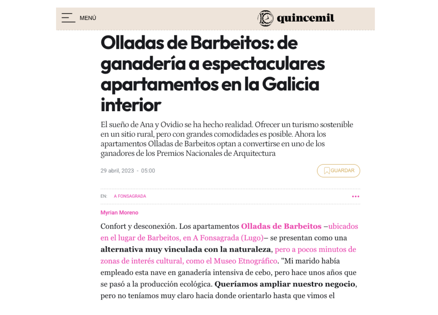 Nuestro proyecto no solo ha conquistado a quienes nos visitan, sino también a profesionales de la arquitectura y el diseño. La singularidad de transformar un antiguo cebadero en un conjunto de apartamentos de lujo, respetando el entorno natural y utilizando materiales locales, ha despertado el interés de jurados y expertos a nivel nacional.