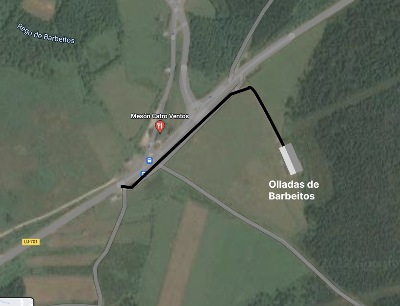 Una vez hayas llegado A Fonsagrada solo tienes que seguir 5 minutos más por la carretera LU-701. Simplemente, sigue recto en la misma dirección que venías. Una vez en Barbeitos encontrarás el Mesón 4 ventos en una intersección de caminos, a la derecha encontrarás los apartamentos Olladas de Barbeitos.